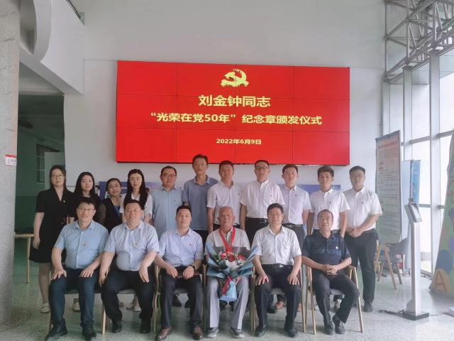 6月9日下午,555电影 党委邀请退休党员刘金钟教授莅临学院指导,并为其举行了庄重简朴的“光荣在党50年”纪念章颁发仪式。学院班子成员、各支部书记、行政人员等参加了仪式。