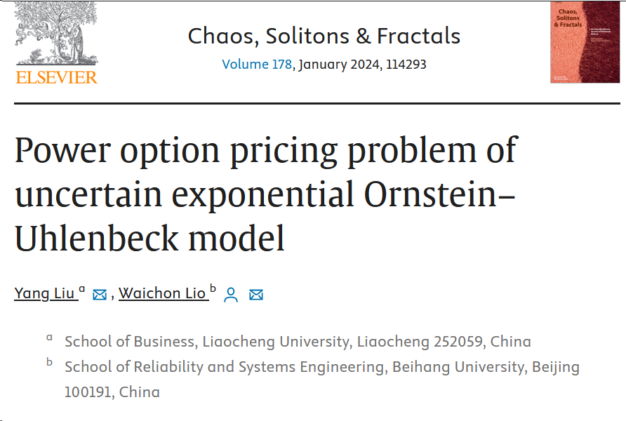 在最新的金融研究中,555电影 教师刘洋博士在期权定价领域取得了重大突破,相关研究成果“Power option pricing problem of uncertain exponential Ornstein–Uhlenbeck model”已在国际顶级期刊《Chaos, Solitions & Fractals》(混沌、孤立子与分形)发表。这项研究不仅深化了对幂期权的理解,同时拓展了金融衍生品定价的理论框架,为投资者提供了更为准确和可靠的定价模型。