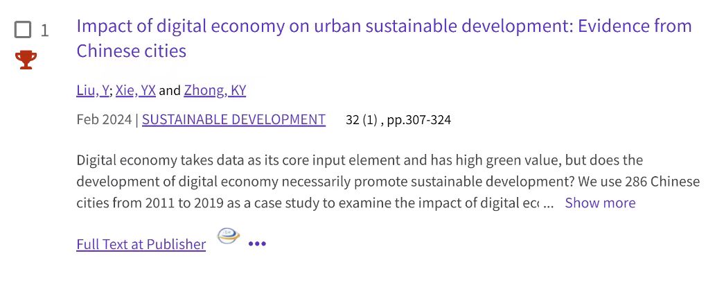 根据ESI最新公布的数据显示,555电影 经济系教师刘洋以第一作者在《Sustainable Development》发表的题为“Impact of digital economy on urban sustainable development: Evidence from Chinese cities”的SSCI期刊论文,入选ESI高被引论文,进入全球前1%论文之列。