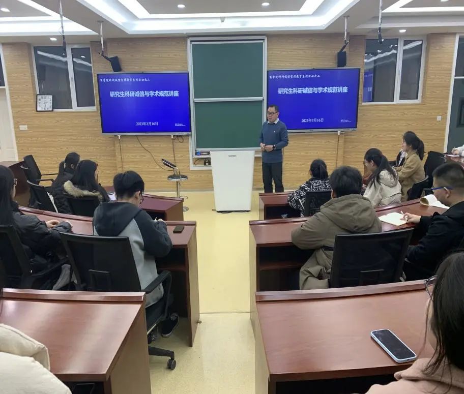 此次讲座是学院科研诚信宣传教育系列活动之一,旨在持续强化全体研究生科研诚信意识,学习科研诚信的规范要求。在下一步工作中,学院将继续加强科研诚信教育,使科研诚信意识深植于心,以诚信促学风,营造良好的科研氛围。