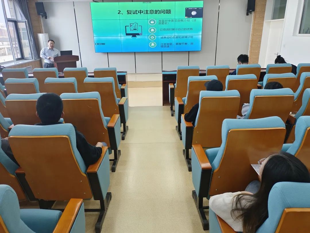 “人生的常态应该就是为了仅1%的希望,去付出200%的努力!”,王院长鼓励同学们确立目标,努力追梦,他从英语阅读与口语问答、指定笔试科目题、专业面试题、随机提问这四个基本的复试环节展开介绍。并深入浅出地讲解了调剂的含义与基本原则,告知大家应该明确自身和成绩的定位,以积极向上的心态面对考研复试。