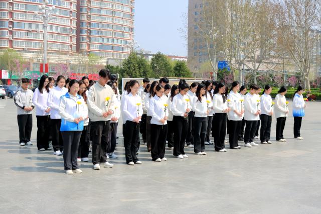 上午十时,聊大青年学子肃立在革命烈士纪念碑前,齐唱《中华人民共和国国歌》,向为民族独立、人民解放而浴血奋战、英勇牺牲的革命烈士默哀并依次献花致敬。