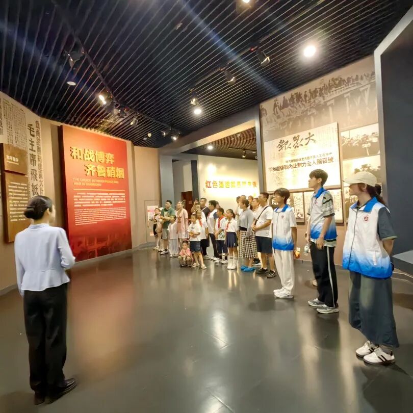 实践队聚焦革命文化基因的当代转化,选取解放阁、济南国动初心长廊、英雄山革命纪念馆等核心红色地标展开深度调研。在解放阁,队员们担任“红色讲解员”,结合珍贵展品为随行的小朋友们讲述革命历史,在互动中探寻红色教育赋能文化认同的路径。在济南国动初心长廊,队员们通过专业讲解与专题访谈,系统梳理泉城国防动员发展史中蕴含的忠诚、担当、奉献等精神特质,深入剖析这些“文化基因”如何成为驱动城市攻坚克难、创新发展的深层动力源。在英雄山革命纪念馆,队员们通过实地参观史料、遗物,聆听莱芜战役、济南战役等重大历史事件背后的故事,重点挖掘革命精神在凝聚民心、激发奋斗意志方面的时代价值。基于此,队员们综合运用实地观察、深度访谈、案例分析等方法,系统梳理革命文化资源活化利用的现状与瓶颈,聚焦革命文化基因与区域发展动能的内在关联,初步提炼出“精神传承—价值转化—发展驱动”的关键路径要素,并围绕红色资源如何有效融入城市更新、文旅融合、精神培育等场景提出针对性思考。