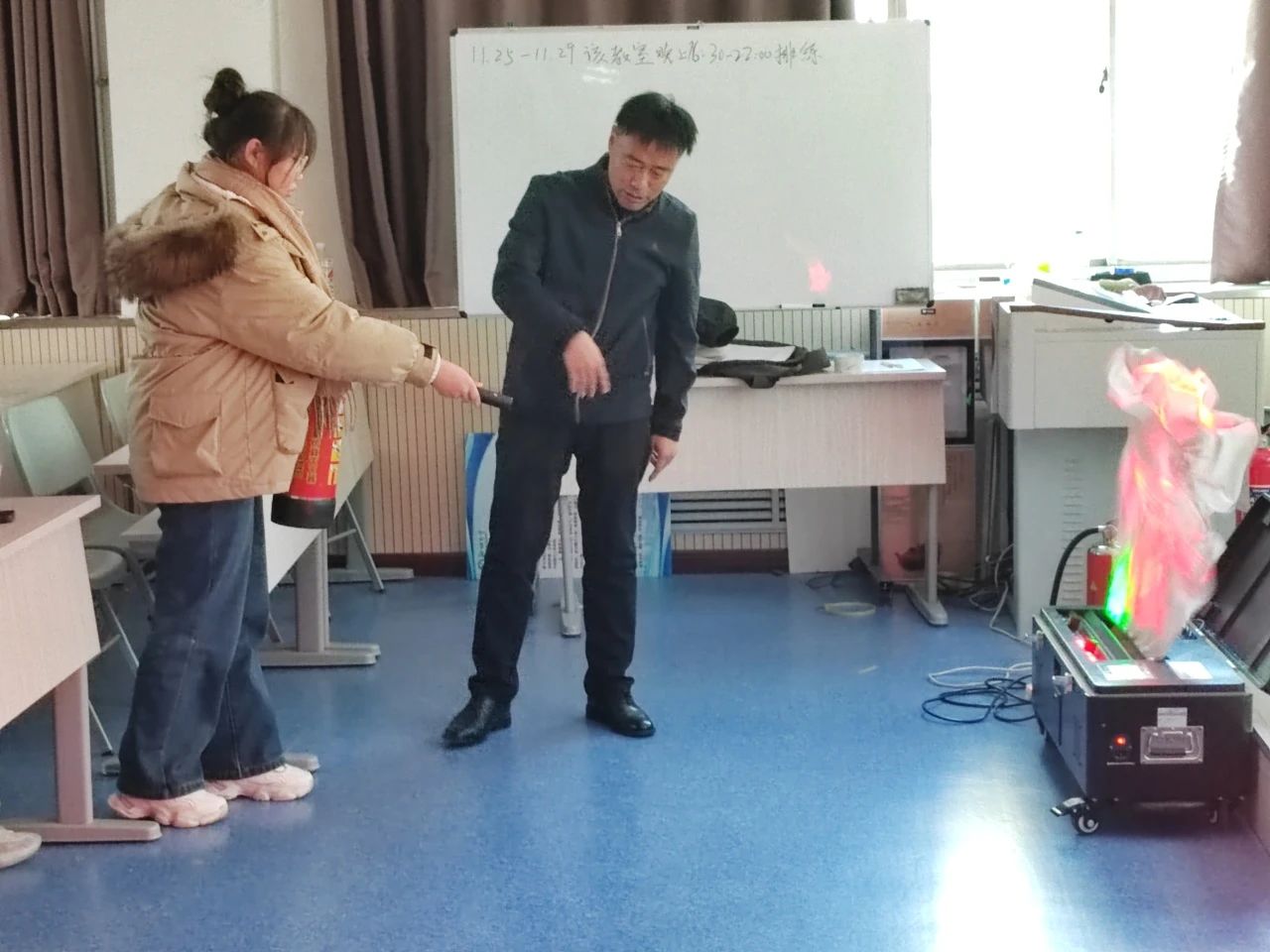 马国栋、马飞借助图片和视频等多种媒介,深入讲解了火灾的定义、特性、等级以及基础的预防措施和常见的灭火方法,并结合近年来各大高校实际发生的火灾案例,系统揭示了学生公寓中普遍存在的消防安全误区和潜在的火灾风险,教授了在不同火灾情况下的紧急逃生技巧。此外,主讲教师还详细介绍了干粉灭火器、二氧化碳灭火器等常见灭火器材的工作原理和使用方法,并利用手提式干粉灭火器进行了现场演示,有效增强了同学们面对火灾时的应急处理能力。
