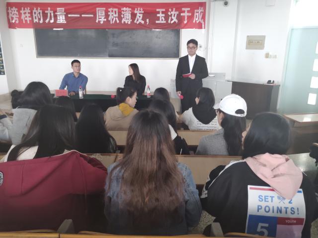 “人不率,顺不从;身不先,则不信。”“厚积薄发,玉汝于成”榜样的力量是无穷无尽的。本着亲近同学贴近实际的原则,此次活动将采用邀请优秀的学长学姐分享经验的讲座形式。伴着主持人浑厚的声音本次活动正式拉开帷幕。首先是法学院的孙盼盼学姐通过PPT为我们讲述她的奋斗和努力。学姐分别从英语成绩的重要性、学业培养与发展、任职情况等方面作了详细解析。李钦伟学长的演讲风格是成熟稳重的,他从学生工作方面向同学们分享自己的工作和生活经验。最后的提问环节,同学们纷纷根据自己的实际情况向学姐学长提问。不管是考研与就业的关系、工作与学习的平衡还是说调皮的同学们的对恋爱观的探讨,学姐学长们都认真作答。