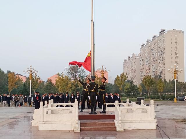 7时整,迎着朝阳,国旗护卫队迈着铿锵有力的步伐护送国旗入场,伴随着高昂的《义勇军进行曲》,五星红旗冉冉升起,全体师生齐唱国歌,激动人心的旋律激发了在场师生浓厚的爱国热情。2021年10月25日是中国人民志愿军抗美援朝71周年纪念日,在抗美援朝战役中,无数英雄用生命拼来了山河无恙、家国安宁。在飘扬的国旗之下,全体师生向所有在抗美援朝战争中牺牲的烈士们庄严默哀。