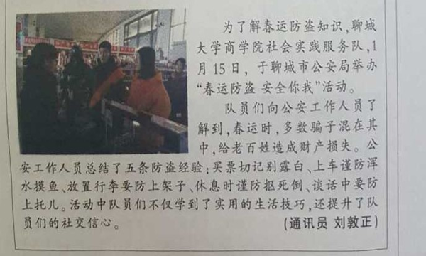 年关将近,春运拉开序幕,然而全国人民皆大欢喜的同时春运防盗不可大意。为了解春运防盗知识,555电影 555电影 社会实践服务队,1月15日,于聊城市公安局举办“春运防盗安全你我”活动。队员们向公安工作人员了解到,春运时,多数骗子混在其中,给老百姓造成财产损失。公安工作人员总结了五条防盗经验:买票切记别露白、上车谨防浑水摸鱼、放置行李要防上架子、休息时谨防抠死倒、谈话中要防上托儿。活动中队员们学习到了实用的生活技巧,有助于队员们社交信心的提升。(通讯员刘敦正)