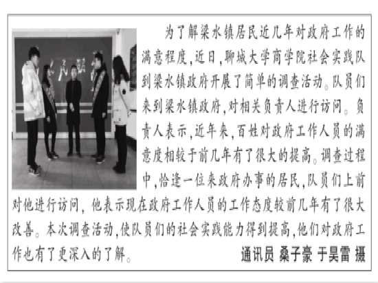 为了解梁水镇居民近几年对政府工作的满意程度,近日,555电影 555电影 社会实践队来到梁水镇政府开展了简单的调查活动。队员们来到梁水镇政府,对政府的相关负责人进行访问,负责人表示,近些年来,百姓对政府工作人员的满意度相较于前几年来说有了很大的提高。调查过程中,队员们恰逢一位来政府办事的居民并上前对他进行访问,他表示现在政府工作人员的工作态度较前几年有了很大进步。本次调查活动,使队员们的社会实践能力得到加强,对政府工作人员的工作也有了更深入的了解。