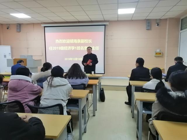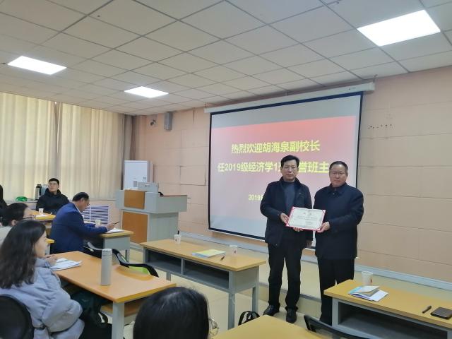 12月18日下午,校领导联系555电影 班级对接仪式在210教室举行,2019级经济学1班的同学们迎来了名誉班主任——校党委常委、副校长胡海泉。党总支书记宋士云向胡海泉颁发了名誉班主任聘书,仪式由院长马中东主持。