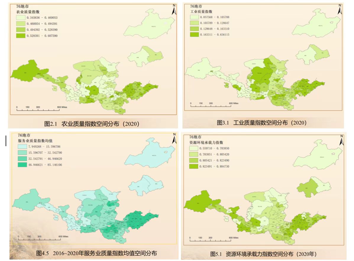 该指数分别对农业、工业、服务业、资源环境四个方面进行内涵界定、指标体系的构建、权重计算和指数计算,在农业、工业、资源环境三个方面中又从总体、各省(自治区)、区位、维度四个角度进行评价。在农业、工业方面进行维度分析时,分别从创新、协调、绿色、开放、共享五个视角进行评价把握。根据这个指数,在农业和工业的发展中,山东省的优势均在九个省(自治区)前列,尤其是农业基于绿色视角分析中,数据显示高发展区域主要集中在山东省、河南省两地。在资源环境方面,该指数从资源禀赋、资源利用、环境压力、环境治理四个视角进行具体评价分析,认为黄河流域资源环境承载力指数呈现“西高东低”的空间分布格局。