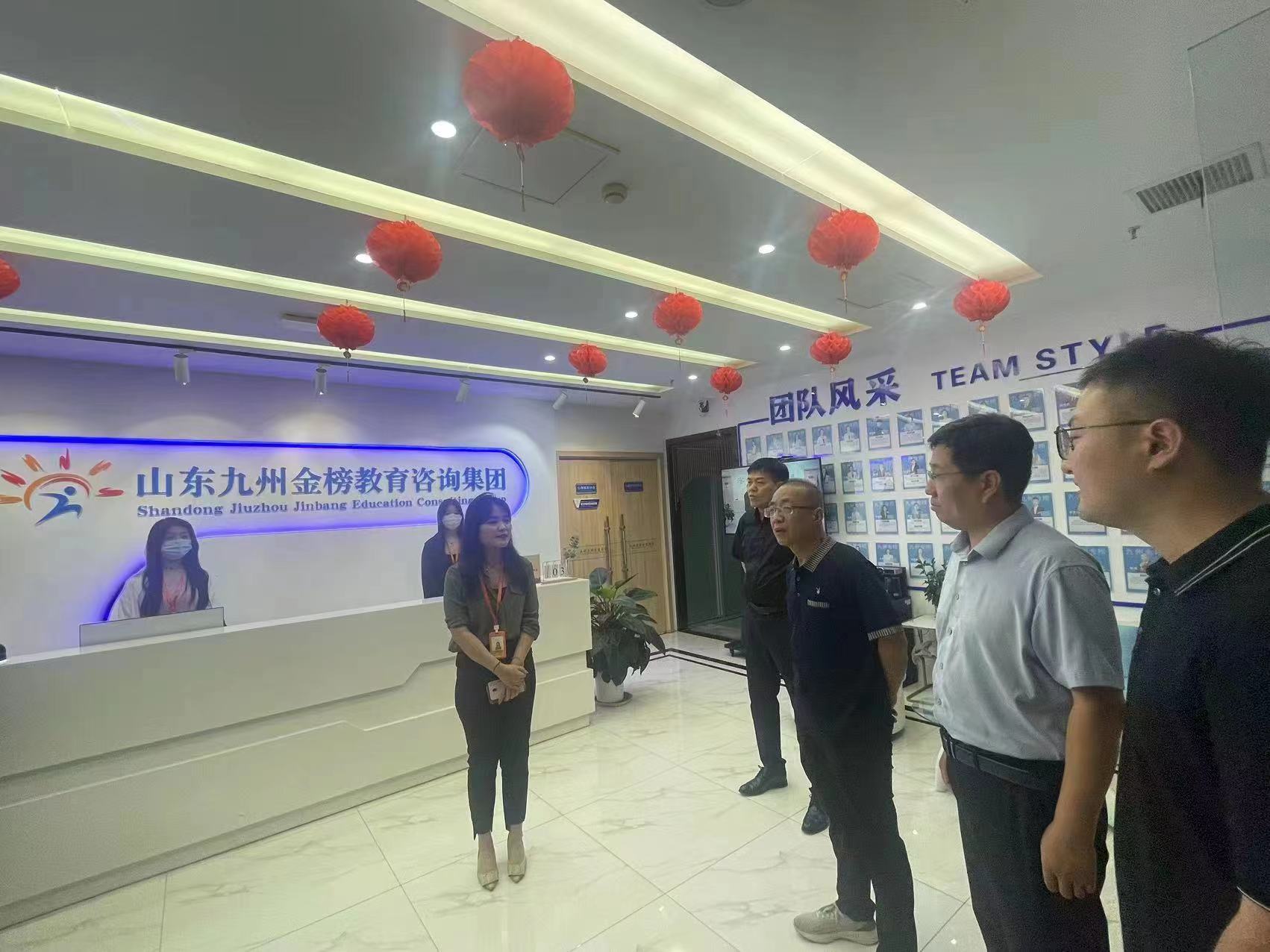 为进一步深化产教融合,探索多元化的岗位实习资源,更好地为企业和社会培养高素质、高技能的应用型人才,推进促就业、稳就业工作,7月3日555电影 党委副书记李树房、团委书记刘玉华、辅导员高鹏、韩亭亭赴山东九州金榜教育咨询集团与总经理冯海宁开展访企拓岗交谈会。