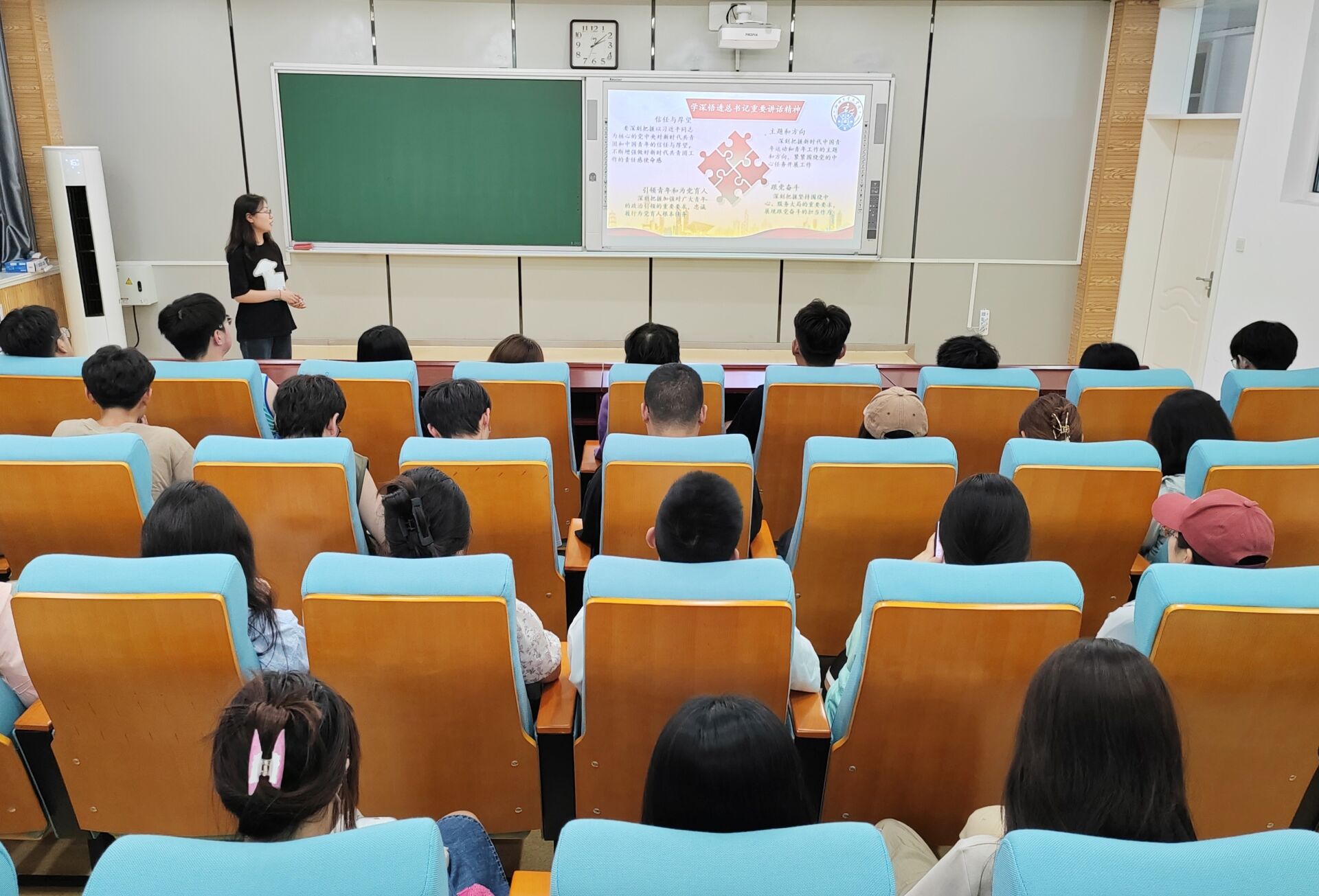 在深学细悟习近平总书记重要讲话的深刻内涵这一部分,主讲人从“主题、方向、群团发展,领导和支持”这四个方面讲起,阐释了习近平新时代中国特色社会主义思想的精神实质和丰富内涵,在场学生认真听讲,仔细记录。接着,主讲人为学生们深入浅出地讲解了“坚持以上率下,强化示范带”,“发挥组织优势,扩大覆盖范围”,“拓宽宣传渠道,浓厚学习氛围”等习近平总书记重要讲话的深刻含义,以便更好地培养学生对党的政治认同、思想认同、理论认同、情感认同。为全面对照习近平总书记重要讲话精神和党的二十大确定的中心任务,我校积极参与各类赛事,认真组织各项活动,不断优化服务机制、搭建展示舞台,推动各领域青年学子更好更快地成长。