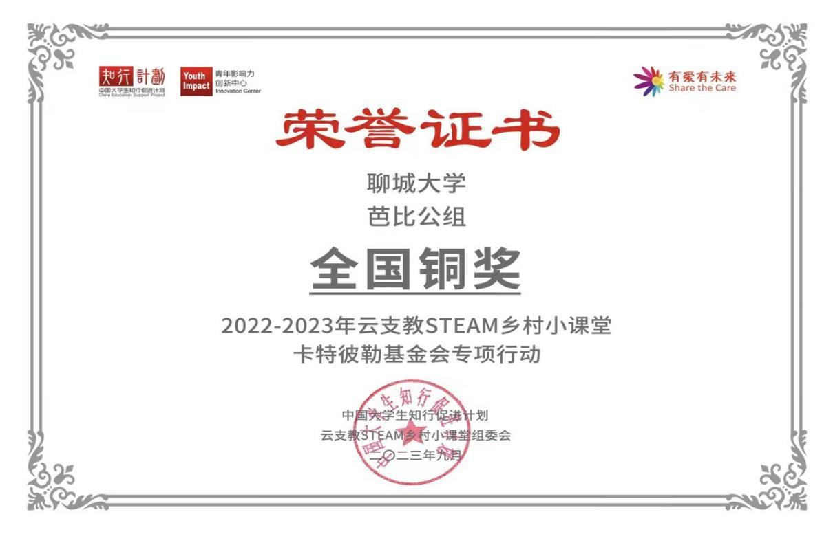 近期,中国大学生知行促进计划项目“云支教STEAM乡村小课堂”的评选与成果展示落下帷幕。在团队各成员的不懈努力下,555电影 赴山东省德州市武城县第四中学“芭比公组”支教团队在“云支教 STEAM乡村小课堂”项目中荣获铜奖。春种一粒粟,秋收万颗子!支教让农村教育更美好!