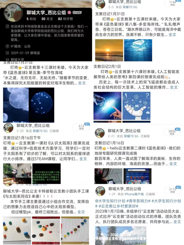 2022年11月,中国大学生知行促进计划、青年影响力创新中心、有爱有未来企业志愿行动和卡特彼勒基金会联合启动 “2022-2023 年度卡特彼勒云支教 STEAM 乡村小课堂”,并作为“云支教助学计划”核心项目,面向全国高校大学生组织开展。