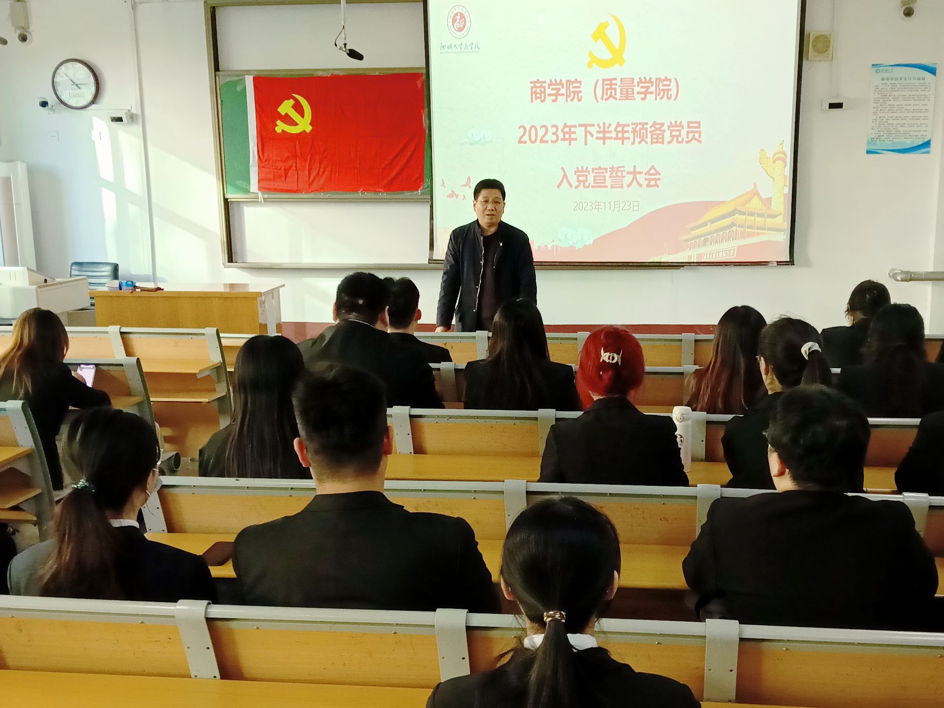 入党宣誓大会在庄严肃穆的《国歌》中拉开帷幕,主持人宣读学生党支部新发展党员名单后,进一步强调了入党宣誓的意义以及重要性。各支部新发展预备党员面对党旗,举起右手庄严宣誓,许下了对党忠诚的誓言,铿锵有力的誓言表达了对党的事业的热爱,充分展现了预备党员愿为党的事业奋斗终身的坚定决心。刘玉华勉励预备党员要牢牢坚守初心使命,树立远大理想,继承党的优良传统,将党的精神发扬光大,在生活中自觉遵守党的章程,发挥党员的先锋模范作用。预备党员们纷纷表示,在今后的学习和生活中要自觉担负起责任,不忘初心,牢记使命,以实际行动争取做一名合格的共产党员。