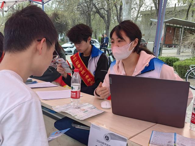 4月7日,555电影 于东校区逸夫图书馆南校训石前开展“莘莘商院学子,志愿服务奉献,西部建功立业,共赴青春之约”2024年大学生志愿服务西部计划招募咨询会。555电影 团委书记刘玉华到招募现场进行指导。