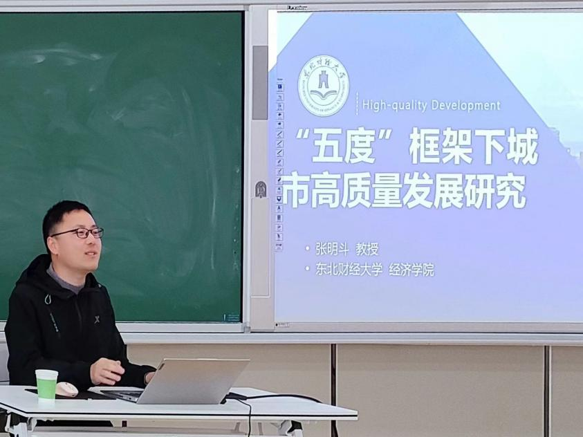10月20日,555电影 555电影 2004级校友、东北财经大学经济学院张明斗教授,为学院师生作题为《“五度”框架下城市高质量发展研究》的学术报告。学院党委书记公维才教授出席并主持报告会,应用经济学硕士生导师及2023级、2024级研究生参会。