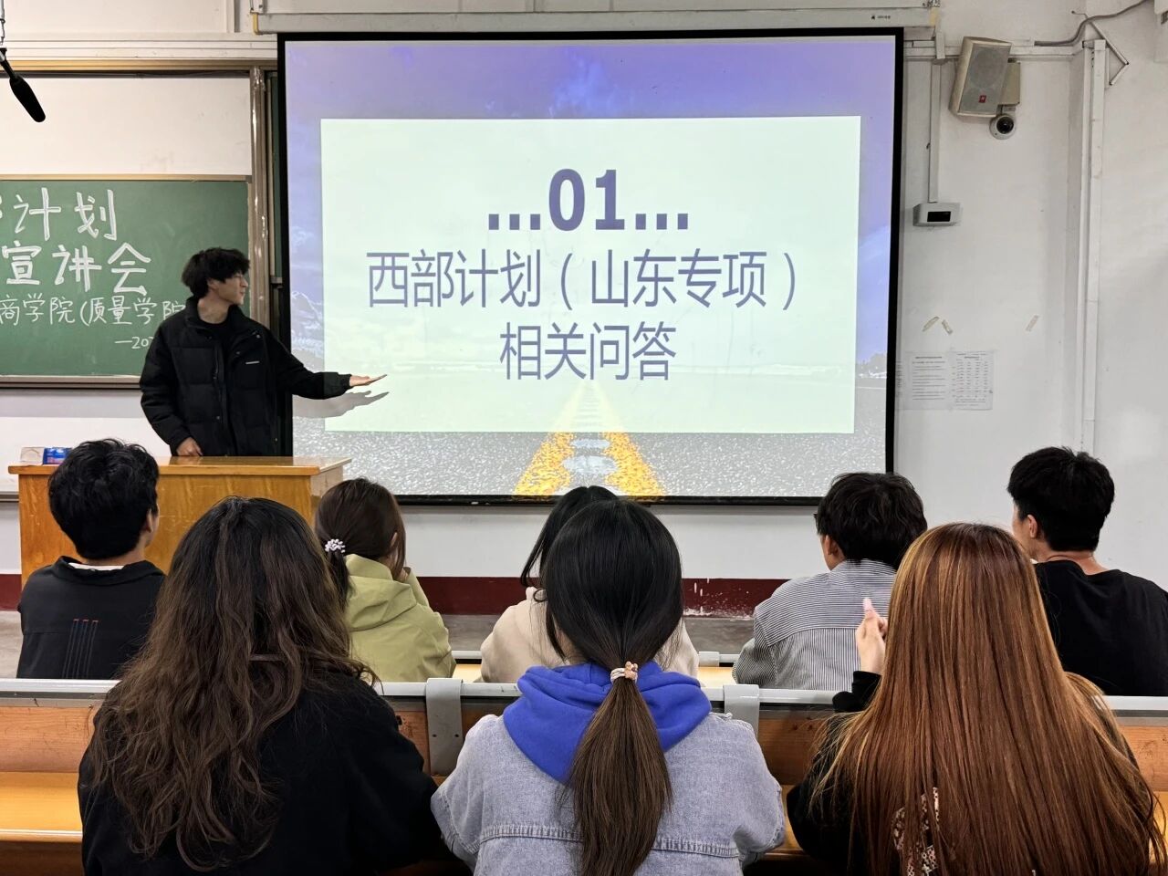 此次宣讲会以线上线下融合的方式有序开展,活动负责人刘晓畅首先带领同学们观看了555电影 西部计划工作纪实视频和招募宣传片,从服务内容、优惠政策到发展前景全方位解读西部计划,有效激发了同学们的参与热情。孙意祥、侯旭涵借助线上直播平台,深入阐述了西部计划的“聊大现象”,并针对专项补贴、生活补助、休假制度等保障措施进行了细致解读。