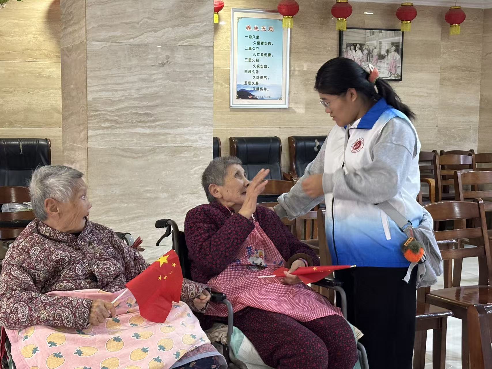 活动期间,工作人员引导志愿者分成“陪伴组”与“服务组”,同步推进工作。陪伴组的志愿者特别关照庭院中休憩的老人,耐心倾听他们的生活经历和故事,通过关怀对话为老人们送去关怀;服务组则配合护理人员,为行动不便的老人调整轮椅、加盖毛毯、整理物品,并搀扶他们缓缓行走,两组共同努力迅速融洽了现场氛围。随后,志愿者陪同爷爷奶奶一同前往活动室,带领爷爷奶奶齐声高唱《我和我的祖国》,并向爷爷奶奶们送上了提前准备的手工贺卡,精心制作的卡片让爷爷奶奶们脸上绽放的笑容更加温暖动人。
