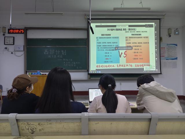 宣讲会以“政策解读+案例分享+互动答疑”为核心脉络展开,志愿服务部工作人员宋雨灿在系统剖析西部计划核心内容的基础上,详细阐释报名审核、笔试面试、统一体检、签约报到的全环节要求,明确七月中旬报到培训、可申请延期服务等重要规则流程。在保障政策方面,宋雨灿重点讲解服务期间的中央财政补助、地方配套支持及社保缴纳等保障措施。同时,针对服务期满后的考研加分、公务员定向岗位、学费代偿等有关政策,宋雨灿也结合公考数据进行了详细说明,有效明确了定向岗位竞争压力小、进面分数优势显著等学生发展拓展路径。此外,宋雨灿还生动分享了学院往届优秀志愿者的基层服务事迹,充分展现了“西部计划”项目对学生个人的成长价值。